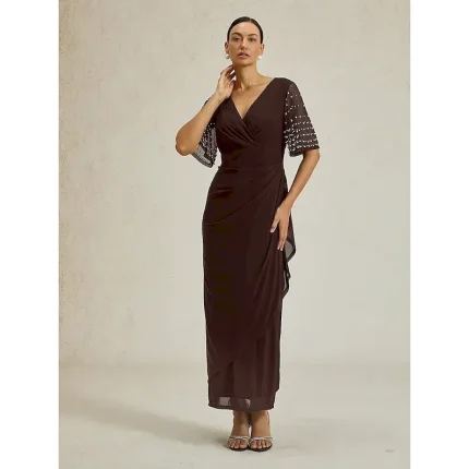 Women’s Maxi Dress Sheath Dress Elegant Solid Color Short Sleeve V Neck Brown Summer Spring Fall