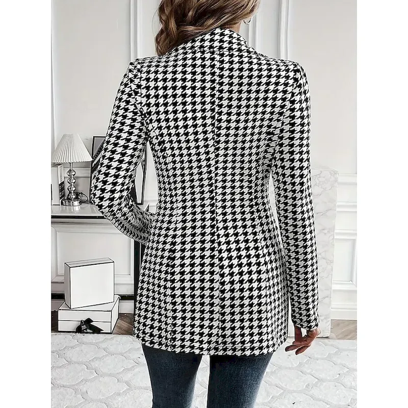 [Design Highlights]: Boasting a classic black and white check print, the blazer includes elegant details such as a notched lapel collar and an open-front placket. The long sleeves and hip-length cut make it perfect for layering, while the overall design exudes timeless sophistication.