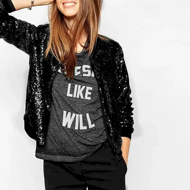 Women’s Bomber Jacket Casual Jacket Comfortable Breathable Zipper Pocket Sequin Fashion Modern Casual Plain Going out Weekend Zipper Regular Stand Collar Regular Fit Long Sleeve Outerwear Black Wine