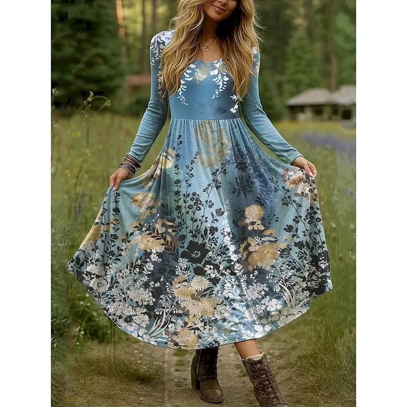 Women’s Maxi Dress Fit And Flare Dress Vacation Casual Boho Party Daily Going out Regular Fit Floral Polka Dot Long Sleeve Crew Neck Blue Sky Blue Purple Green Fall Winter