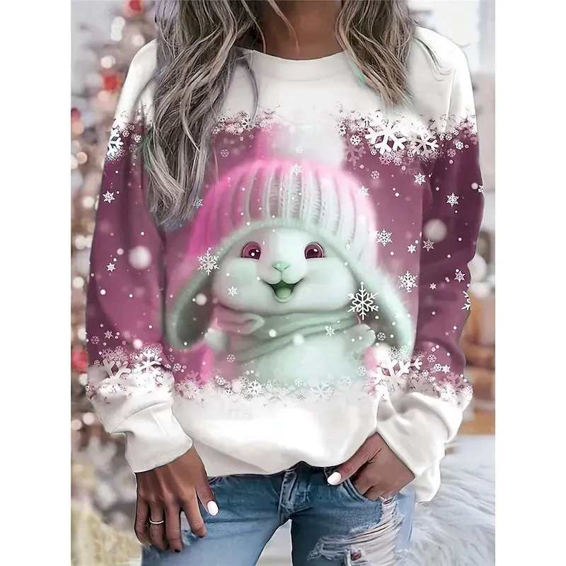 [Fabric]: The sweatshirt is crafted from high-quality polyester, offering warmth and comfort during the colder months. The material ensures a cozy feel, perfect for fall and winter wear.[Fit]: Designed with a regular fit, this sweatshirt provides a relaxed and comfortable silhouette, making it suitable for casual, everyday wear.[Design Highlights]: Featuring a charming winter theme, the sweatshirt displays a playful cartoon-style rabbit wearing a knitted hat and scarf, adorned with scattered snowflakes. The base color of classic white allows the colorful design to truly stand out. The crew neckline adds to its casual, laid-back vibe.[Occasions]: Ideal for Christmas gatherings, winter outings, or simply a cozy day at home, this sweatshirt suits a variety of seasonal events. Pair it with jeans or leggings for an effortlessly cute and whimsical look.[Size Range]: Available in sizes S, M, L, XL, and 2XL, offering a range of options to accommodate different body types and preferences.OK