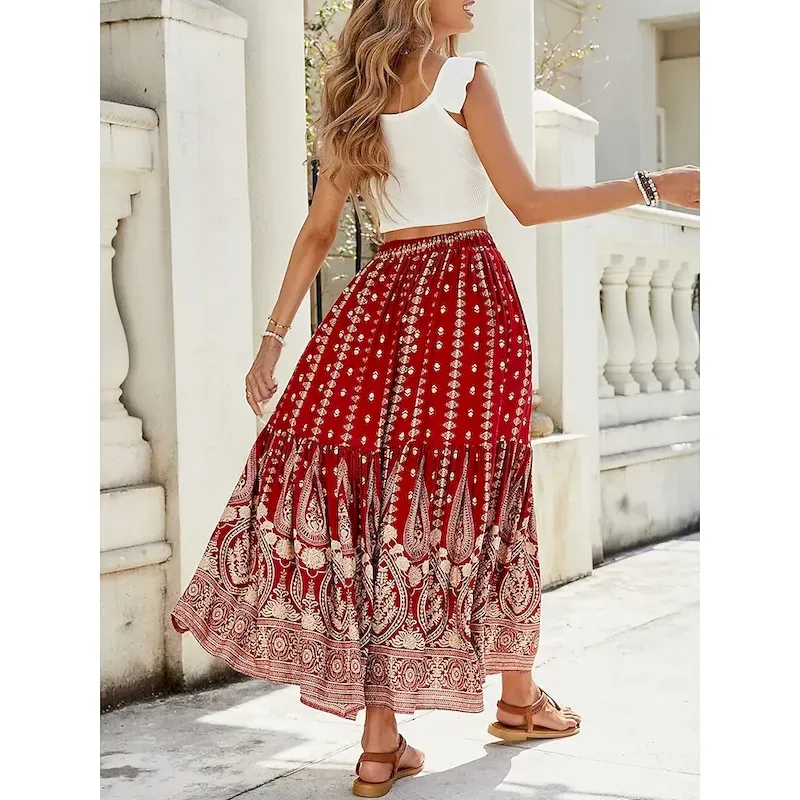 Women’s Swing Bohemia Fashion Casual Maxi High Waist Skirts Graphic Print Micro-elastic Street Daily Red Blue Green Summer Rayon