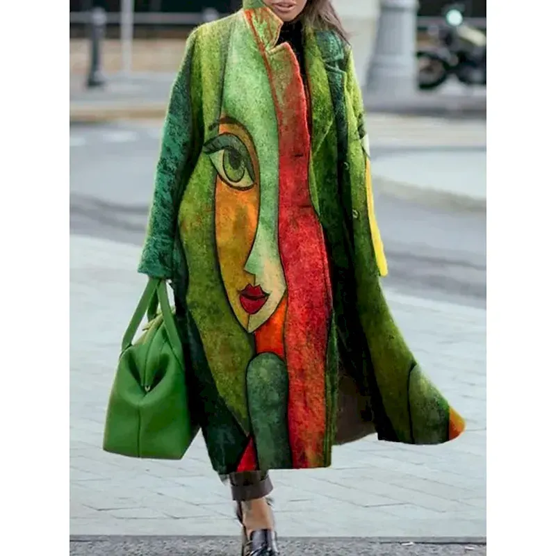Women’s Winter Coat Coat Comfortable Breathable Print Modern Casual Geometric Vacation Street Casual Daily Wear Open Front Long Turndown Regular Fit Long Sleeve Outerwear White Dark Green Green